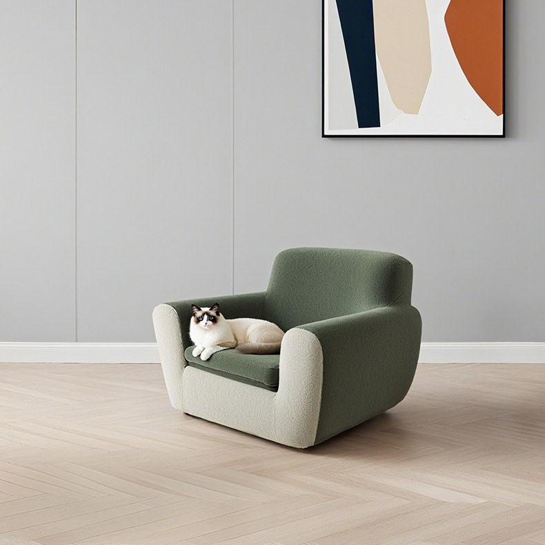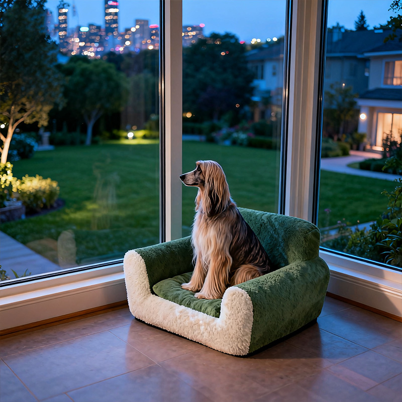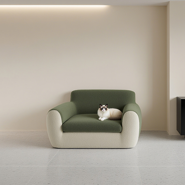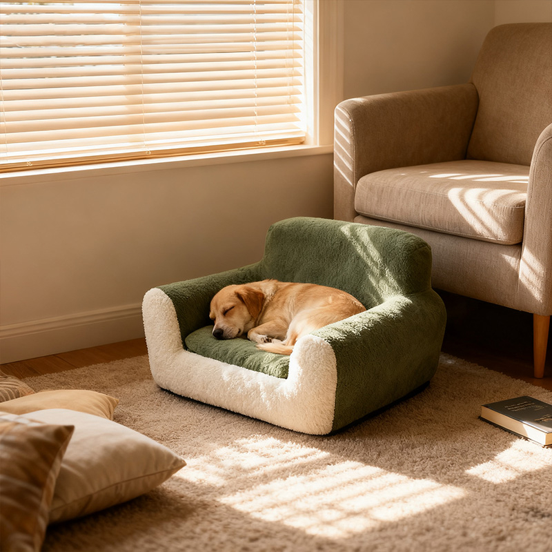 The MY-042 features a refined combination of moss green and coffee brown velvet fabric. This artistic pet sofa transcends functionality to become part of home décor. It showcases the pet owner's sophisticated taste while seamlessly integrating into modern, minimalist, or Nordic-style living spaces. The smooth silhouette and balanced color tones bring a sense of calm and creativity into any room.